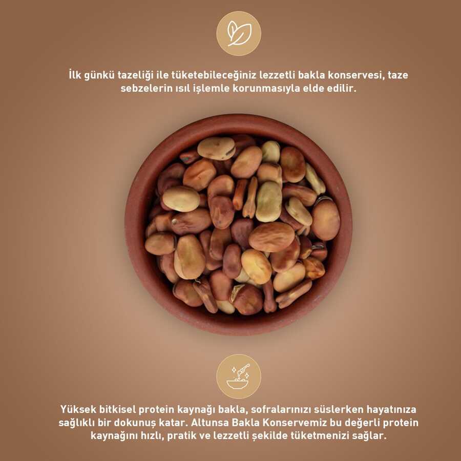 Bakla konservesi en sevilen pratik lezzetlerimiz arasında yer alır. Hem doğal bir protein kaynağı olması hem de eşsiz lezzetiyle gönülleri fetheder. Bahar aylarında toplanan taze baklalardan elde edilen konserve ilk günlü tazeliğiyle sunulur. İster ısıtarak isterseniz de soğuk şekilde tüketilebilir. Günün her saati hazır yemek olarak, pilav üstü garnitür olarak değerlendirilebilir. Pratik konservelerimiz size zaman kazandırırken doyurucu bir öğün geçirmenize de imkan verir. Sağlıklı ve doğal içerikli bakla konservesi yüksek besin değerlerine sahiptir. Bakla, protein, lif, vitamin ve mineral açısından zengindir. Bu ürünü kapağını açar açmaz dilediğiniz gibi tüketebilirsiniz. Sonsepet olarak taze, lezzetli, sağlıklı ve pratik konserve çeşitlerine ekonomik fiyatlarla ulaşabileceğiniz olanaklar sağlıyoruz. Online alışverişte fark yaratan müşteri dostu hizmetlerimizle mükemmel alışverişin tadını çıkarabilirsiniz. Anında müşteri desteği alabilir, WhatsApp, telefon, site mesajı gibi farklı iletişim yöntemlerini tercih edebilirsiniz. Yüksek kalitede, sağlıklı ve lezzetli ürünler alırken, online alışveriş ayrıcalıklarımızla sorunsuz ve mutlu alışveriş deneyimi yaşayabilirsiniz. Altunsa Bakla Konservesi 400 Gr ürünümüzü sitemiz üzerinden her zaman en uygun fiyat seçenekleri ile satın alabilirsiniz. Ekonomik mutfak alışverişi yapmak için Sonsepet’teki birbirinden kaliteli ve lezzetli ürünleri değerlendirebilirsiniz. Her detayda memnun kalacağınız müşteri dostu olanaklarımızla, bütçe dostu online alışveriş avantajını yaşayabilirsiniz.