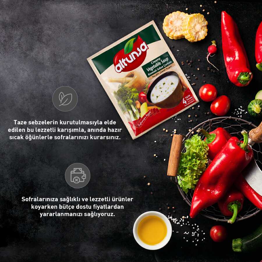 Mutfak alışverişi yaparken hem ekonomik hem de sağlıklı ürünler almak istediğinizi biliyoruz. Bu nedenle sağlıklı, lezzetli ve kaliteli hazır çorba seçeneklerinde bütçe dostu fiyat olanakları sağlıyoruz. Bütçe dostu fiyatlarla yüksek kaliteyi yaşayabileceğiniz ürün seçeneklerimiz arasında yer alan Altunsa Kremalı Sebze Çorba, sağlıklı ve lezzetlidir. Pratik ev yapımı çorba kıvamı ve katkısız içeriğiyle beğeni toplar. Sofralara sıcak ve keyifli öğünler getiren Altunsa markasının hazır çorbalarında yerli marka kalitesini yaşarsınız. Sonsepet olarak uygun fiyatlı ve yüksek kalitede, sağlıklı gıda seçeneklerine kolay ulaşmanızı sağlıyoruz. Online alışveriş yaparken en iyi fiyatla son noktayı koyabileceğiniz ürün seçeneklerimizi değerlendirebilirsiniz. Hayatı kolaylaştıran hazır çorba lezzetini yerli markadan kalite güvencesiyle satın alabilirsiniz. Mutlu müşterilerimiz arasına katılarak siz de ekonomik alışverişte kalite farkını görebilirsiniz. Altunsa Hazır Çorba Kremalı Sebze 60 Gr ile 4 kişilik sıcak sofralar hazırlayabilir, vakit harcamadan sağlıklı ve lezzetli öğünlerin keyfini çıkarabilirsiniz. Her daim keyifli ve kaliteli sofralar kurmanız için ekonomik fiyatlı ürün seçenekleri sunuyoruz. Sofralarınıza keyif ve kalite katarken, uygun fiyat avantajını yaşatıyoruz. Altunsa Hazır Çorba Kremalı Sebze ürünümüzün siparişini ister sitemizden tek tıkla, ister WhatsApp üzerinden yazarak, isterseniz de bizi arayarak verebilirsiniz.