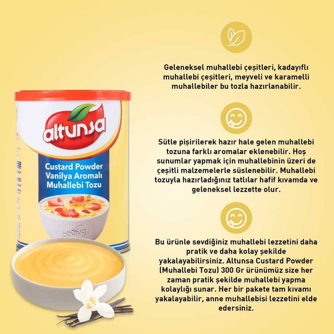 Altunsa Vanilya Aromalı Muhallebi Tozu 250 gr x 2 Adet ile tatlılarınıza kolayca lezzet katın. Her anınıza tatlı bir dokunuş ekleyin!