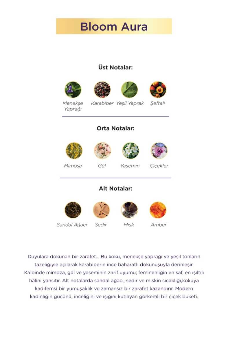 Cildinizde taze bir bahar sabahının ferahlığını ve çiçeklerin en saf halini hissetmeye hazır mısınız? Bloom Aura, minimalist zarafeti ve transparan yapısıyla modern kadının imza kokusu olmaya aday. Su bazlı, ipeksi ve nefes alan dokusuyla klasik parfümlerin ağırlığından uzaklaşan bu koku, teninizle bütünleşerek adeta "ikinci bir ten" hissi yaratır. Zarif, duru ve sofistike bir aura isteyenler için tasarlandı.