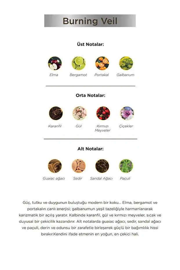 Güçlü, etkileyici ve modern bir amber-odunsu kokuyla fark yaratmak, imzanızı her geçtiğiniz yerde bırakmak için Burning Veil’i hemen sepetinize ekleyin!