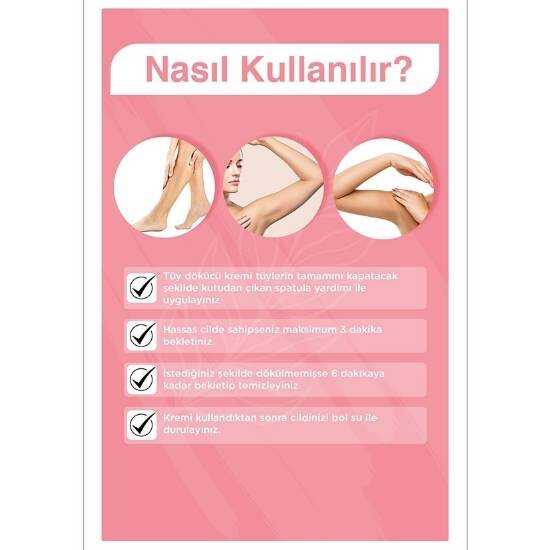Bromaleinin cilt tüylerine etkisi. Kremi paketten çıkan spatula ile uygulama yapılan bölgedeki tüm tüyleri kaplayacak şekilde uygulayın.Kremi ciltte tam olarak 3 dakika bekletin ve ardından spatula ile küçük bir alanı test etmek için temizleyin. o. Krem tüyleri kolayca çektiyse kalan kısımları temizleyin (hassas cildiniz varsa 3 dakika kadar bekletin). Hala istediğiniz gibi dökülmediyse 6 dakika bekleyin ve temizleyin. Kremi maksimum 6 dakika ciltte bırakın. Kremi kullandıktan sonra cildi bol su ile yıkayınız. Kullanım süresi "hassas ciltler" için 3 dakikayı, "normal ciltler" için 6 dakikayı geçmemelidir. Bacaklarda, kollarda, koltuk altlarında ve bikini bölgesinde kullanılmak üzere tasarlanmıştır. Yüz, baş, göğüs, perianal ve genital bölgelerde kullanıma uygun değildir. Lekeler, benler, ter, yaralar, kesikler, egzama, varisler, çatlamış, tahriş olmuş, güneş yanığı olan cilt, son 72 saat içinde tüy almış ve daha önce tüy dökücü kremlere tepki vermiş bölgelerde kullanmayınız.