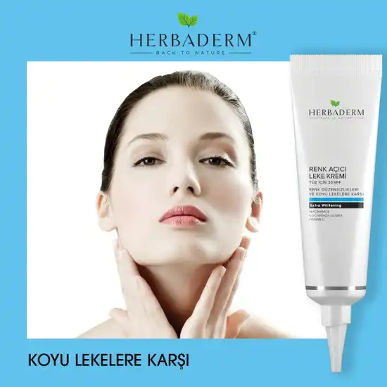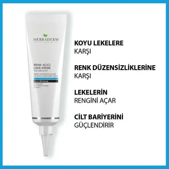 Güneş ışınları, çevresel kirlilik, sigara, stres gibi dışsal tehditlerin sebep olduğu cilt yaşlanması, ciltte koyu lekelere ve bölgesel kararmalara neden olur; cilt homojen ve aydınlık görünümünü kaybeder. Herbaderm Renk Açıcı Leke Kremi, koyu leke karşıtı bileşenleri sayesinde güneş lekelerine, yaşlılık lekelerine ve diğer kararmalara karşı cilt tonunu düzenleyerek homojen hale getirmeye yardımcı olur. İçeriğindeki Tio2 ve organik güneş filtreleri, yeni leke oluşumuna karşı cildi korumaya yardım eder.