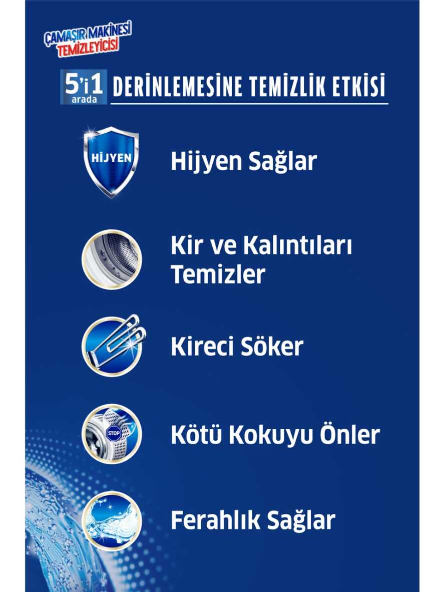 Kir ve Kalıntı Temizleyici: Kazan içi ve kapak lastiğindeki kirleri ve deterjan artıklarını temizler.