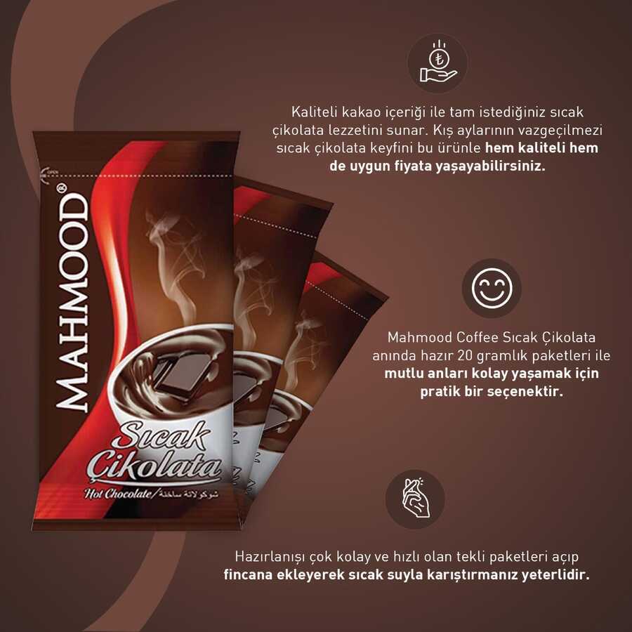 Hayata keyif katan lezzetlerden biri olan sıcak çikolata, soğuk ve mutsuz anlara samimi bir sıcaklık katar. Mahmood Coffee Sıcak Çikolata, 20 gramlık tek kullanımlık paketleriyle pratik ve hızlı bir sıcak çikolata deneyimi sunar.