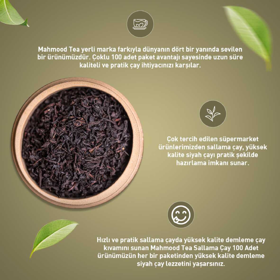 Sallama çay kolaylığına lüks çay lezzetini ekleyen Mahmood Tea Sallama Çay pratik ve ekonomiktir. 100 adetlik kutuda sunulan bu ürün çok uzun süre kaliteli çay ihtiyacınızı karşılar. Kolay şekilde her yerde istenen her zaman hazırlanabilir. Sadece sıcak suya paketten çıkan çayı sallamak yeterlidir. Her bir 2 gramlık poşet bir fincan çay yapmanızı sağlar.Dünyanın dört bir yanında kalitesiyle tercih edilen Mahmood Çay çeşitlerine kolay, hızlı ve ekonomik şekilde ulaşabilirsiniz. Online alışverişte ayrıcalıklı müşteri hizmetlerimizi keşfederek güvenilir, sorunsuz ve keyifli online alışveriş keyfini her zaman yaşarsınız. Mahmood Tea Sallama Çay 100 Adet siparişini WhatsApp’tan kolay sipariş şeklinde verebilir ya da ürünü ekonomik alışveriş sepetinize ekleyerek alışverişinizi tamamlayabilirsiniz. Anında müşteri desteği, iletişim hattı, hızlı teslimat, ücretsiz karo, kolay iade imkanlarıyla siz de online alışverişte ayrıcalıklı müşteri olmanın avantajlarından yararlanabilirsiniz.