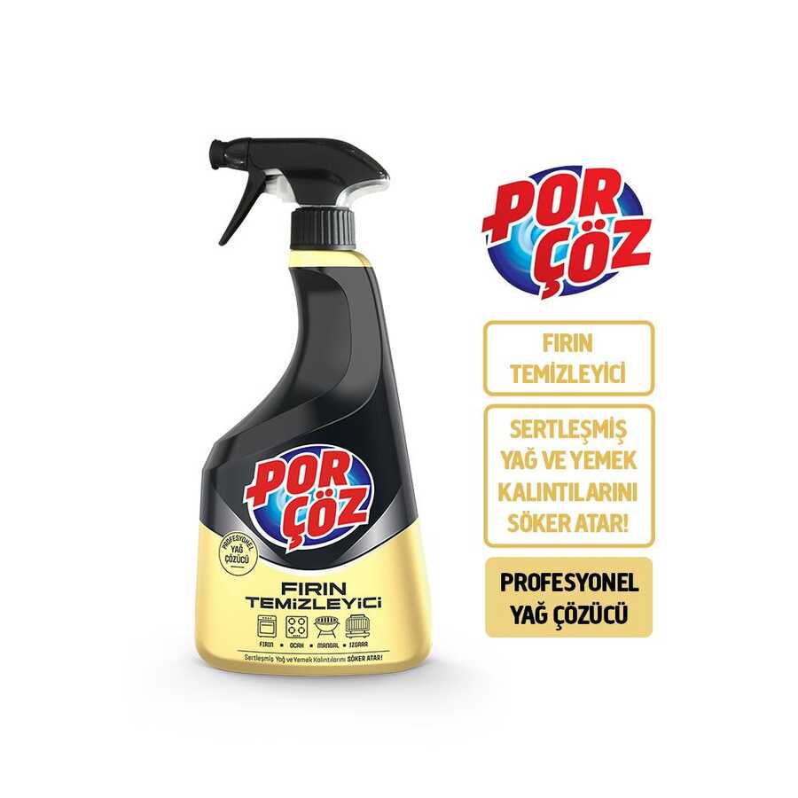Porçöz Fırın Temizleyici Sprey, Porçöz uzmanlığıyla geliştirilmiş güçlü formülü sayesinde en zorlu yağ lekelerini, yanmış ve kurumuş ya artıklarını zahmet vermeden söker atar. Fırın içi, fırın tepsisi, fırın telleri, ızgara, mangal, barbekü, ocak üstü, tava ve tencere gibi yüzeylerde etkili temizlik sağlar.